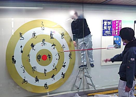 パレスサイドビル1階の毎日書道会入り口横のショーウインドーで13日、ディスプレーの模様替えがあり、今年の干支である「午」などの書を一面にあしらった大きな的に矢が飛ぶ飾りがお目見えしました。