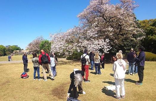東京都心は8日、午前中から青空が広がり、パレスサイドビル向かいの皇居東御苑は多くの人でにぎわいました。天守台前の本丸大芝生では、盛りを過ぎたものの、ほぼ満開といえるソメイヨシノの花をバックに、海外からの旅行者たちが写真を撮っていました。